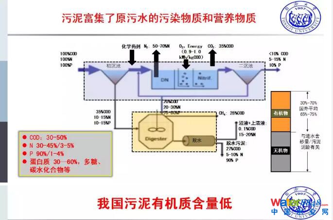 為什么我們對(duì)污泥處理這么重視?因?yàn)槲覀冎涝谝粋(gè)污水廠整個(gè)的處理過程中,大部分的有機(jī)物,或者相當(dāng)一部分的有機(jī)物,大部分的磷,還有相當(dāng)一部分的氮全部富集到污泥當(dāng)中去了,所以污泥是富集了污水當(dāng)中的污染物和營(yíng)養(yǎng)物質(zhì)。那么倒過來講,這部分的物質(zhì)如果沒有經(jīng)過進(jìn)一步的處理,將會(huì)對(duì)水環(huán)境,甚至大環(huán)境造成二次污染。所以污泥應(yīng)該和污水處理同步的,我們國(guó)家屬于為數(shù)不多的國(guó)家只重視了水的標(biāo)準(zhǔn),排水的質(zhì)量,但是在污泥這個(gè)方面相對(duì)來說是比較滯后。所以我們認(rèn)為污泥的處理在某種程度上,因?yàn)樗碾y度比污水處理更高,所以應(yīng)該說它的迫切性比我們現(xiàn)在目前提標(biāo)改造到四類水更加重要。其實(shí)我們也核算過經(jīng)費(fèi)并不是很大,還是一個(gè)重視的程度。