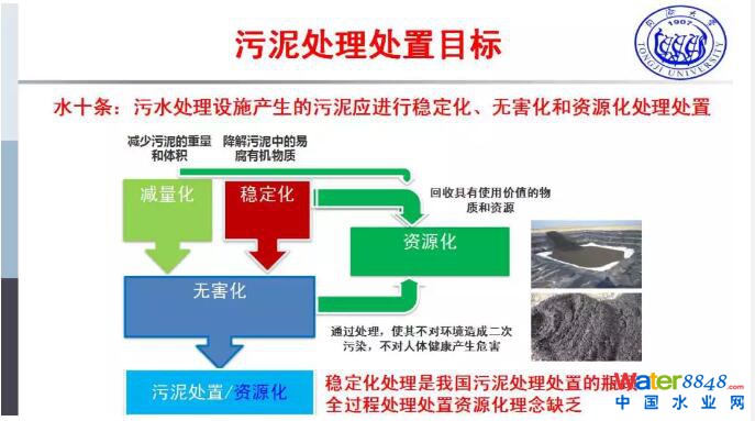 這個(gè)是我們?cè)谇懊嫒〉玫囊恍┏尚В请x我們的目標(biāo)還是有很大的差距,“水十條”明確了污水處理的設(shè)施產(chǎn)生的污泥應(yīng)該進(jìn)行穩(wěn)定化、無害化和資源化的處理處置。當(dāng)時(shí)也有相應(yīng)的時(shí)間節(jié)點(diǎn),現(xiàn)在看來離“水十條”的要求還是有一定的差距。至于污泥處理處置,里面主要是污水當(dāng)中的易降解的有機(jī)物以及重金屬等污染物,從處理處置來說,到底是應(yīng)該遵循什么樣的基本原則和目標(biāo)?我們都知道污泥污水處理處置原來一直提到的是“四化”——減量化、穩(wěn)定化、無害化和資源化,這個(gè)是我們一直掛在嘴上的,但是其實(shí)這個(gè)"四化"目前以及未來還是指導(dǎo)我們污泥處理處置很重要的基本原則。作為減量化來說是降低污泥的體積,因?yàn)樗时容^高,同時(shí)還有一個(gè)很深層次的含義,要把污泥的量通過機(jī)械或者其他的方式降低。那么作為穩(wěn)定化來說,這個(gè)也是我們國(guó)家現(xiàn)在污泥處理處置的短板,因?yàn)槲勰喈?dāng)中有大量易腐的有機(jī)物,而這些易腐的有機(jī)物容易產(chǎn)生惡臭,容易到水體再進(jìn)一步消消耗水體的氧氣,進(jìn)一步的生物降解,所以容易產(chǎn)生二次污染。為什么世界上的發(fā)達(dá)國(guó)家對(duì)污泥的穩(wěn)定化有一個(gè)明確的要求,也就是說污泥出了污水廠之前必須要對(duì)污水廠沒有處理掉的這部分的易降解的有機(jī)物要處理完,才能運(yùn)出污水廠,所以穩(wěn)定化也是相當(dāng)重要;無害化是涉及到后續(xù)的處置,比如說污泥當(dāng)中含有重金屬等其他物質(zhì),怎么樣通過一些處理手段,根據(jù)處置的要求去實(shí)現(xiàn)無害化的處理;資源化提的是在減量化、無害化、穩(wěn)定化的過程當(dāng)中,應(yīng)該采取更加能夠資源回收的技術(shù)路線,所以減量化、穩(wěn)定化、無害化、資源化是這樣一個(gè)關(guān)系。