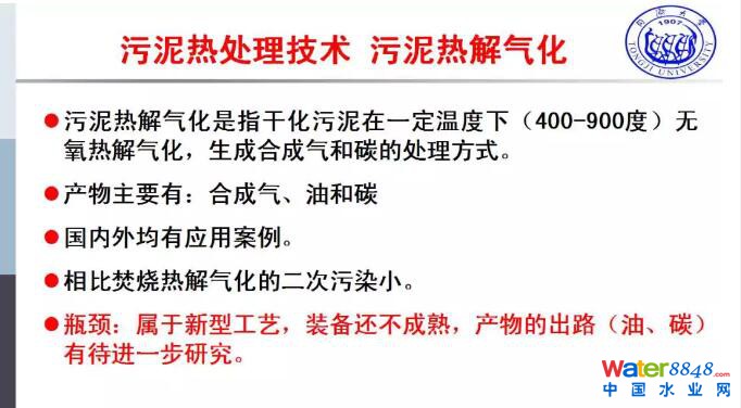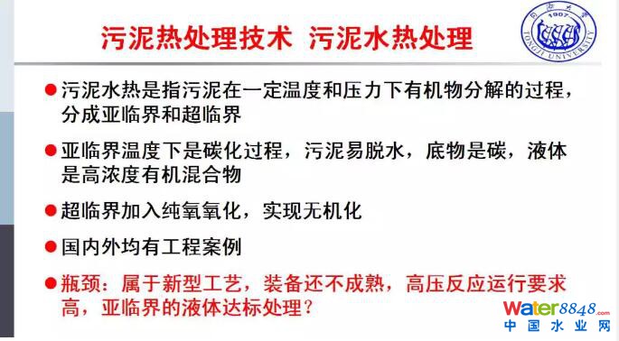 我們都知道焚燒的成本很高,尾氣處理的要求比較高,同時(shí)可能很多地方政府受到的在環(huán)評(píng)的要求,包括臨壁效應(yīng)、公眾的接受度,它的優(yōu)勢(shì)是減量比較徹底,比如說一千噸的污泥,干化焚燒以后,最后的灰渣還有800噸,如果是厭氧消化加上干化還有200噸,也就是一倍多的概念。總體來說從很多的決策部門來說,認(rèn)為這還是一個(gè)減量徹底的技術(shù)。協(xié)同焚燒在我們國(guó)家已經(jīng)有很多的案例,也有很多地方把協(xié)同焚燒再回到了獨(dú)立處理,這個(gè)當(dāng)中主要是發(fā)電廠有一定產(chǎn)能的限制,還有水泥窯的限制,在垃圾焚燒的時(shí)候涉及到污泥在垃圾焚燒里面是不是能夠很完整的解決掉,否則會(huì)影響垃圾焚燒最后處理的效果,因?yàn)橐蠡以袡C(jī)物的含量不能5%。當(dāng)然有污泥的熱解、氣化的技術(shù),這些技術(shù)和污泥焚燒相比,二次污染要小得多,這屬于新型工藝,對(duì)單一的工業(yè)的機(jī)制技術(shù)比較成熟。在污泥方面,目前還是屬于示范的階段。產(chǎn)物的出路,碳、油也需要進(jìn)一步的探討。污泥的水熱處理也是一個(gè)單元技術(shù),這個(gè)當(dāng)中有氧臨界、超臨界,氧臨界主要問題是出來的液體有機(jī)物的濃度很高,還有很多難降解的有機(jī)物。在超臨界涉及到成本的問題,總體來說也是屬于新型的工藝,有前途的工藝,但是裝備和技術(shù)方面還有待于進(jìn)一步的提升。