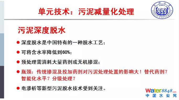 我這里沒有提到的一塊重要研究領(lǐng)域,在污泥處理過程中如何降低污泥量,這個(gè)也是一個(gè)研究的方向。剛剛提到了在處理處置的全鏈條過程當(dāng)中涉及到了很多單元技術(shù),而這些單元技術(shù)在整個(gè)的全鏈條當(dāng)中到底有哪些優(yōu)勢(shì)或者哪些還需要提升?我想第一個(gè)污泥的減量化處理,這個(gè)是一個(gè)共性的技術(shù),首先提到的是污泥的濃縮,濃縮這個(gè)系統(tǒng)應(yīng)該說現(xiàn)在相對(duì)來說比較成熟,遇到了未來的瓶頸,一個(gè)是藥耗如何在進(jìn)一步的降低,另外一個(gè)是在濃縮方面設(shè)備智能化水平,也就是加藥和整個(gè)控制智能化水平有待進(jìn)一步的提升。在污泥脫水方面我們也做了很多工作,技術(shù)也是相當(dāng)成熟。但是這個(gè)當(dāng)中的瓶頸,針對(duì)我們國(guó)家污泥的量大,需要進(jìn)一步的減量,從機(jī)械脫水的角度,我們現(xiàn)在機(jī)械脫水的設(shè)備和能脫水的潛力之間還是有一定的差異,這個(gè)需要我們進(jìn)一步的研究、開發(fā)。第二個(gè)瓶頸問題是藥劑,我們現(xiàn)在的脫水加了大量的化學(xué)藥劑,當(dāng)然這個(gè)是傳統(tǒng)的。在國(guó)外污泥量少,可能不是一個(gè)問題,但是隨著我們國(guó)家這么大的污泥量,包括廠的規(guī)模這么大,新型、綠色、低碳、環(huán)保的藥劑的開發(fā)應(yīng)該是下一步工作的重點(diǎn),或者用其他的處理手段,包括熱處理手段、預(yù)處理來提高脫水效率。當(dāng)然智能化的水平,隨著現(xiàn)在互聯(lián)網(wǎng)的開發(fā),這方面也是會(huì)有一定的發(fā)展。作為污泥的深度脫水,這個(gè)也是我們國(guó)家沒有辦法的辦法,所以加更多的藥劑,再加上一些無機(jī)物質(zhì),這個(gè)作為填埋可以,但是作為其他的處理處置方式,應(yīng)該說還是有一定的影響。但是我認(rèn)為我們?cè)谖鬯畯S追求更高的含水率,但是更環(huán)保、更綠色是我們作為企業(yè),作為科研院所要追求的目標(biāo)。我現(xiàn)在也見到有分級(jí)處理,第一級(jí)脫到80%,在這個(gè)基礎(chǔ)上通過自主創(chuàng)新再脫到70%、60%或者50%,我覺得這些都提供了一些方法,包括現(xiàn)在也有電滲析、真空等方法,這個(gè)也是我們未來的一個(gè)發(fā)展方向。當(dāng)然我們現(xiàn)有的深度脫水、大量藥劑填埋等的成本比較低,但是這不是我們國(guó)家未來的發(fā)展方向。