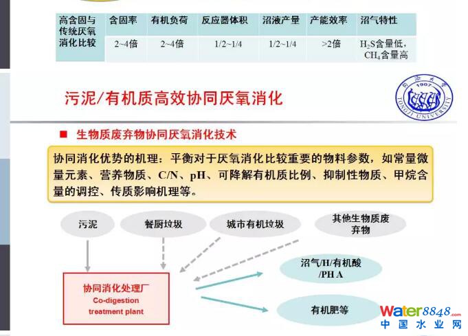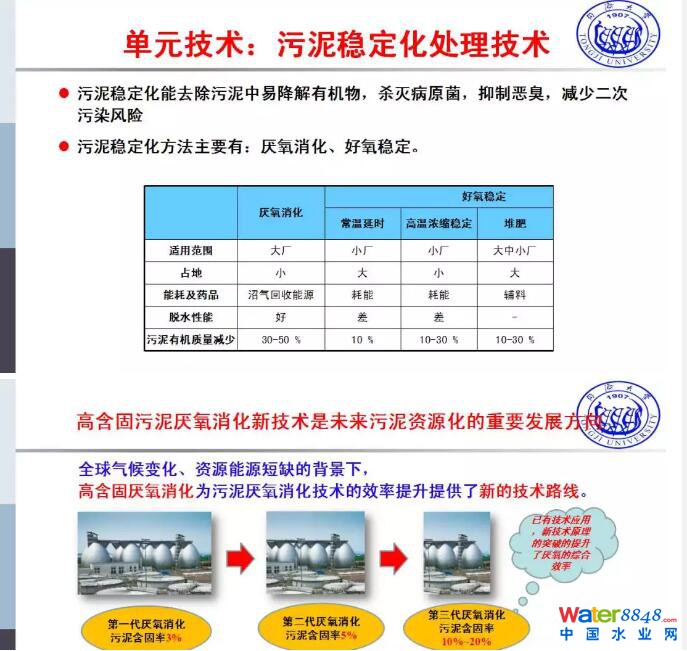 在接下來單元的技術(shù)就是污泥的穩(wěn)定化處理技術(shù),這其實(shí)是一個(gè)“四化”當(dāng)中很重要的一化,主要是能夠降解有機(jī)物質(zhì),滅菌,抑制惡臭,減少二次污染的風(fēng)險(xiǎn),這一塊是我們國(guó)家污泥處置處理的短板。作為穩(wěn)定化的處理,我們知道有厭氧消化,也有好氧穩(wěn)定,那么在好氧當(dāng)中也有延時(shí)報(bào)氣,或者是濃縮污泥高溫耗氧穩(wěn)定,或者我們提到的堆肥的處理方式。這一系列的方式都是利用生物過程降解污水當(dāng)中污水廠沒有降解掉的,而且是易降解、易腐臭的有機(jī)物質(zhì),主要是固體物質(zhì),在厭氧穩(wěn)定方面高含固的厭氧消化技術(shù)取得了比較好的進(jìn)展,F(xiàn)在我們新設(shè)計(jì)的污水處理的項(xiàng)目很多都采用了高含固的厭氧消化,過去我們知道厭氧消化是3%的含固率,后來到5%,上海的白龍港。現(xiàn)在我們的厭氧消化從設(shè)計(jì)來說提到了10%甚至15%,也就是說厭氧消化的油積是大幅度的減少,提升了單位處理的效率,以及厭氧消化的效能。同時(shí)在污泥穩(wěn)定化方面,協(xié)同厭氧消化技術(shù)也得到了很好的發(fā)展,主要是跟餐廚和城市有機(jī)質(zhì)的協(xié)同厭氧消化,在國(guó)內(nèi)也有比較好的工程示范,這樣一方面解決了污泥穩(wěn)定化的問題,同時(shí)也可以通過這樣的方式去解決餐廚、城市有機(jī)質(zhì)資源化利用的問題。投入的成本提升不大的情況下,可以更好的提升基礎(chǔ)設(shè)施的效率。我一直在說傳統(tǒng)的厭氧消化相當(dāng)于一個(gè)造好了的發(fā)電廠,但是只有30%的煤炭在那兒燒,高含度厭氧消化有可能提供60%的碳源,如果再添加餐廚及其他的有機(jī)物可能會(huì)發(fā)揮到80%到90%的效率,這樣可以大大的提升厭氧穩(wěn)定的效率。
