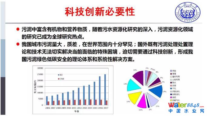 總體來說,從污泥的全鏈條現(xiàn)狀來說,土地利用現(xiàn)在國(guó)家的政策方面還有一定的瓶頸,所以我們叫它無處可去,當(dāng)然現(xiàn)在還有地方去推園林綠化等等去試圖打開這個(gè)路。干化焚燒成本太高,老百姓難以接受,填埋降落的地方會(huì)越來越少,這個(gè)也導(dǎo)致了國(guó)家污泥處理處置比較重要的瓶頸,就是處置的路線沒有得到很好的解決。接下來除了推動(dòng)現(xiàn)有的技術(shù)以外,還是要加強(qiáng)科技創(chuàng)新。應(yīng)該說現(xiàn)在各個(gè)國(guó)家,包括我們國(guó)家在這一方面活力很強(qiáng),論文的發(fā)表情況逐年在增加,可想而知污泥處理處置是一個(gè)很重要的研究熱點(diǎn)。同時(shí)加上我們國(guó)家對(duì)污泥的重視,更需要科研院所加強(qiáng)創(chuàng)新。污泥從生態(tài)文明建設(shè)、低碳等等方面去考慮,從未來來說還是要追求資源化循環(huán)利用、綠色低碳的這個(gè)路線,所以在這個(gè)方面有很多的這方面前期的一些研究。我們也感覺到下面技術(shù)方面在這些方面的突破,特別是污泥提到了資源化循環(huán)和資源化回收,污水的資源化回收當(dāng)中很重要的應(yīng)該是污泥的資源化回收,因?yàn)槲勰嗍前盐鬯?dāng)中的資源物質(zhì)富集到污泥當(dāng)中來。