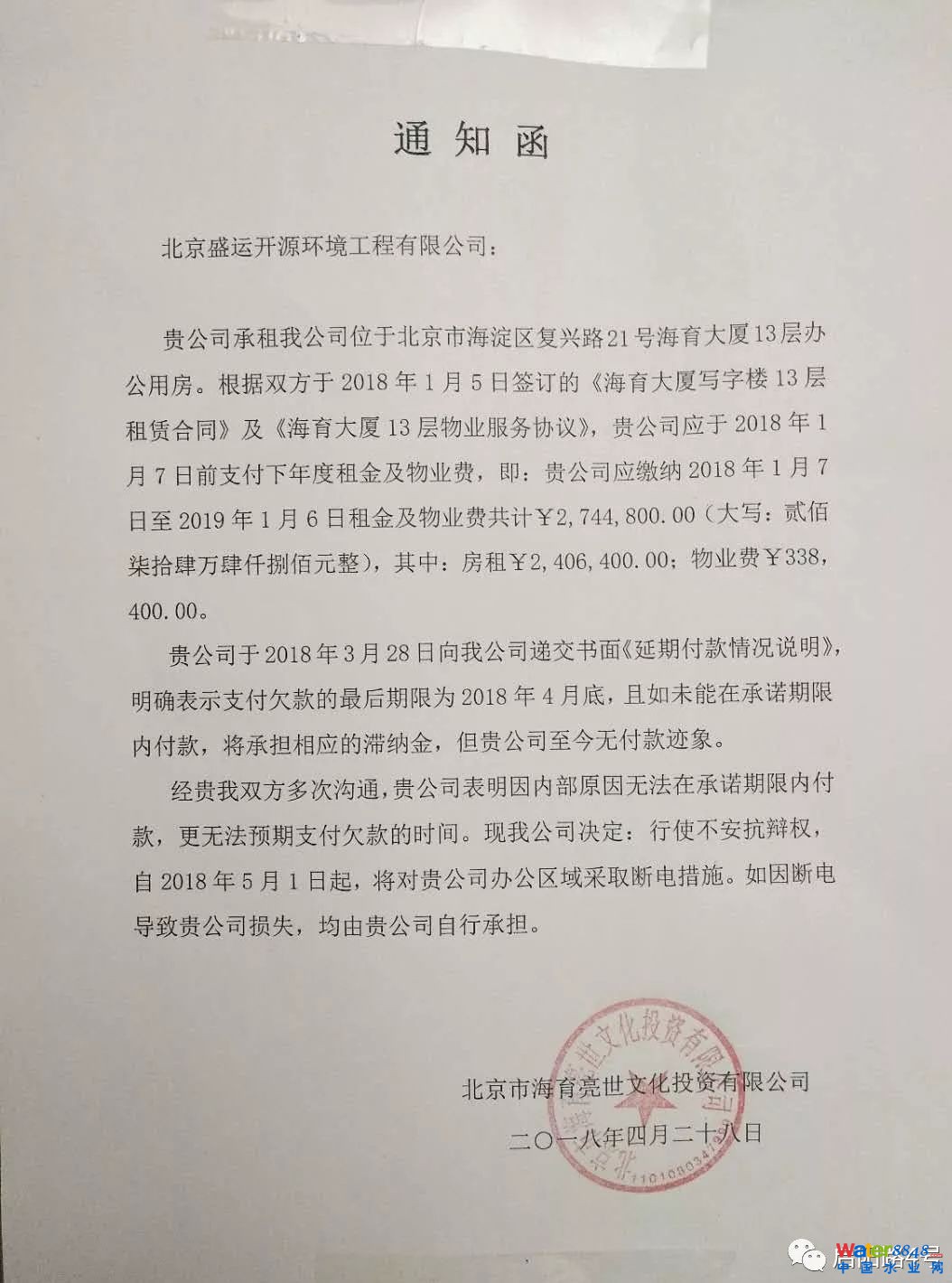 雙方多次溝通,盛運(yùn)方表明因內(nèi)部原因無法在承諾期限內(nèi)付款,更無法預(yù)期支付欠款的時(shí)間。所以,海育亮世決定自2018年5月1日起,對盛運(yùn)方辦公區(qū)域采取斷電措施。而另一份通知還補(bǔ)充道,出于雙方多年租賃關(guān)系,并未在上述日期斷電,盛運(yùn)系承諾5月8日支付部分欠款,但仍未履行承諾,故5月9日起采取斷電措施。該通知署名日期為5月8日。