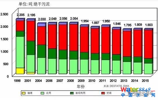 圖2顯示了德國在1998-2015年期間污水廠污泥的處置發(fā)展情況。