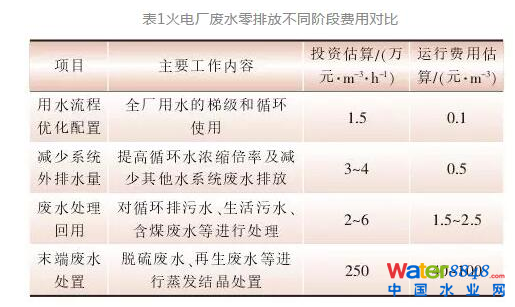 由表1可見,火電廠廢水零排放不是通過簡單一種技術或工藝就可以實現(xiàn),而應該是多種技術工藝的組合.且其實現(xiàn)應該根據各廠的具體情況分步驟實施。隨著廢水零排放工作的逐步進行,其投資和運行費用越來越高,但節(jié)水效果卻越來越小。由于嚴格意義的廢水零排放實施難度大、成本高,目前國內只有極少數(shù)電廠建設了嚴格意義上的全廠廢水零排放系統(tǒng)。