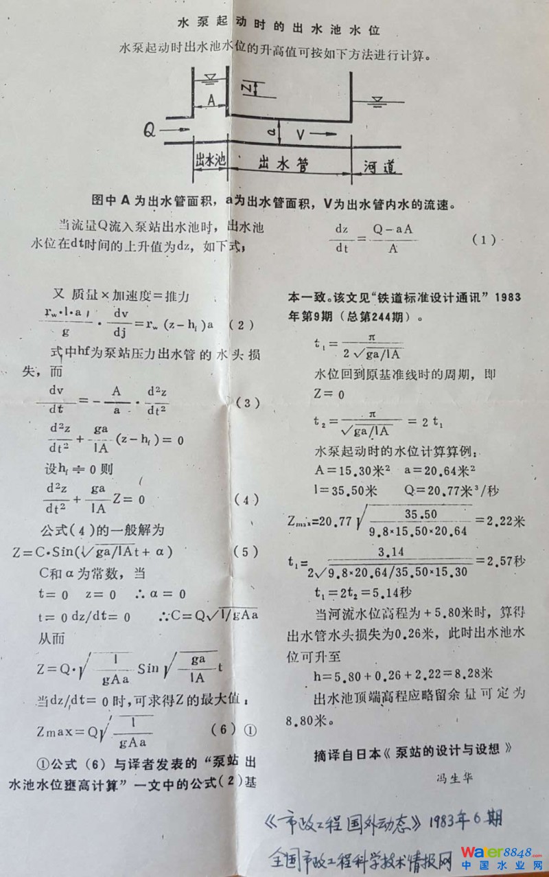 我近在微信群交流中發(fā)現(xiàn)給排設(shè)計手冊算例有誤后,深為不安,因全國各地在建雨水泵站一定不少,此乃防汛工程,馬虎不得 ! 為此,找出當(dāng)年為雨水泵站出水池開泵壅高計算所編譯之舊稿,發(fā)表在此。