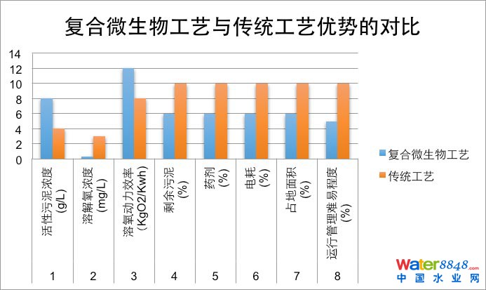 復(fù)合微生物工藝較傳統(tǒng)的生化工藝有著顯著的優(yōu)點(diǎn),實(shí)現(xiàn)了氮短程硝化反硝化(ScND)和同時硝化反硝化(StND)。通過控制較低溶解氧0.3-1.0mg/l,為水解菌、亞硝化菌、反硝化菌等創(chuàng)造一個共生的舒適環(huán)境,使其達(dá)到同步短程硝化反硝化的廢水處理工藝。