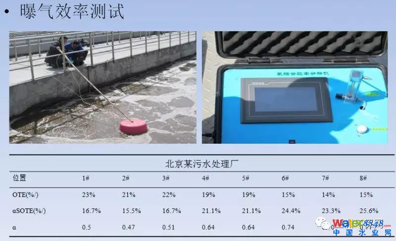 實(shí)際處理能力評(píng)估需要用到一些方法,這些方法一般包括開(kāi)會(huì)討論分析、全廠實(shí)際測(cè)試、工藝模擬分析。開(kāi)會(huì)討論分析通常是相關(guān)方坐在一起討論,這種方式天然上來(lái)說(shuō)是比較保守的,因?yàn)樵跊](méi)有確切數(shù)據(jù)和依據(jù)的情況下,人都是保守的,只能憑經(jīng)驗(yàn)。第二種方法是實(shí)際測(cè)試,實(shí)際測(cè)試包括沉淀池負(fù)荷測(cè)試、氧轉(zhuǎn)移測(cè)試、示蹤劑測(cè)試以及在線監(jiān)測(cè)等,實(shí)際測(cè)試的好處是因地制宜,找出關(guān)鍵參數(shù),明確制約瓶頸。其中,負(fù)荷測(cè)試包括預(yù)處理、曝氣池、沉淀池、污泥脫水單元等方面的測(cè)試,需要明確各個(gè)單元的實(shí)際處理能力,當(dāng)然測(cè)試期間不能影響出水水質(zhì)。這里舉一個(gè)曝氣效率方面測(cè)試的例子,大家知道α值是混合液中氧轉(zhuǎn)移效率與清水中氧轉(zhuǎn)移效率之比,是曝氣計(jì)算過(guò)程的一個(gè)關(guān)鍵參數(shù),國(guó)內(nèi)設(shè)計(jì)規(guī)范是0.8-0.85,美國(guó)在80年代之前也是基本采用0.8,但實(shí)際運(yùn)行中發(fā)現(xiàn)這個(gè)值差別較大,α值和泥齡、水質(zhì)等參數(shù)有關(guān)系,低的能到0.3。實(shí)際上,最為可靠的方法是用尾氣法測(cè)試獲得實(shí)際的α值,這是我們?cè)谝粋(gè)污水廠正在做的尾氣法測(cè)試的照片,美國(guó)已經(jīng)有數(shù)百個(gè)污水廠采用了這種方法。通過(guò)這種方法獲得真實(shí)的參數(shù)為設(shè)備選型提供更加科學(xué)合理的依據(jù)。