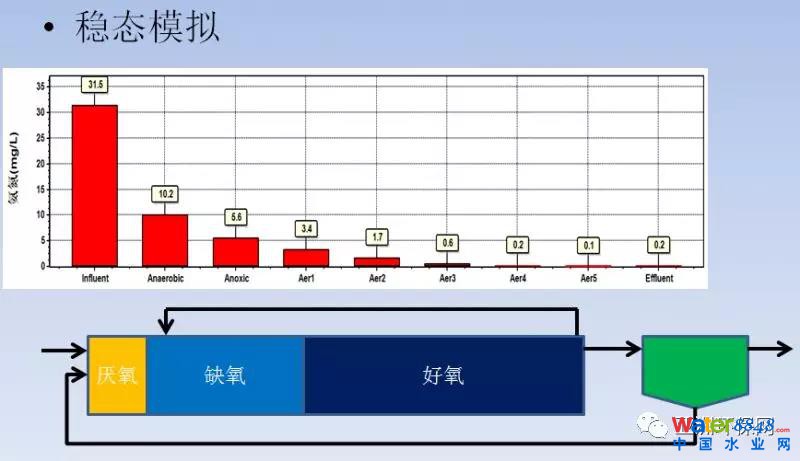 下面這個(gè)圖可以是一個(gè)穩(wěn)態(tài)模擬的反映,可以看出在曝氣池廊道的前端氨氮就已經(jīng)很低了,曝氣池有一定的冗余能力,我們可以通過(guò)動(dòng)態(tài)模擬來(lái)確定其可利用的池容潛力。
