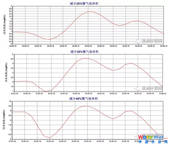 下面這幾個(gè)圖反映了減少不同比例曝氣池池容后的出水氨氮?jiǎng)討B(tài)變化,這就為具體的池容利用提供了可靠的依據(jù)。