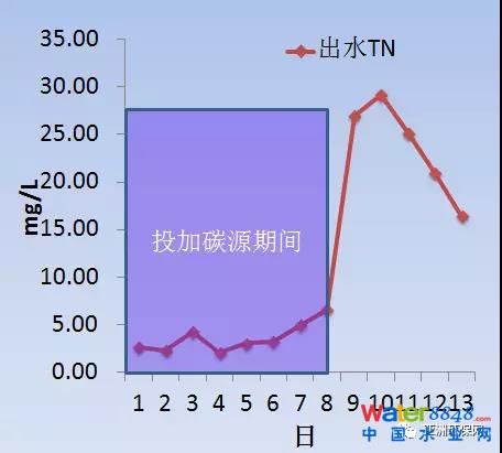 下面這個(gè)圖是山東某污水處理廠的Bardenpho工藝實(shí)際出水水質(zhì),該廠的進(jìn)水COD約200mg/L、進(jìn)水TN約35mg/L,通過(guò)在Bardenpho工藝中投加乙酸鈉后,出水TN可以低于5mg/L。