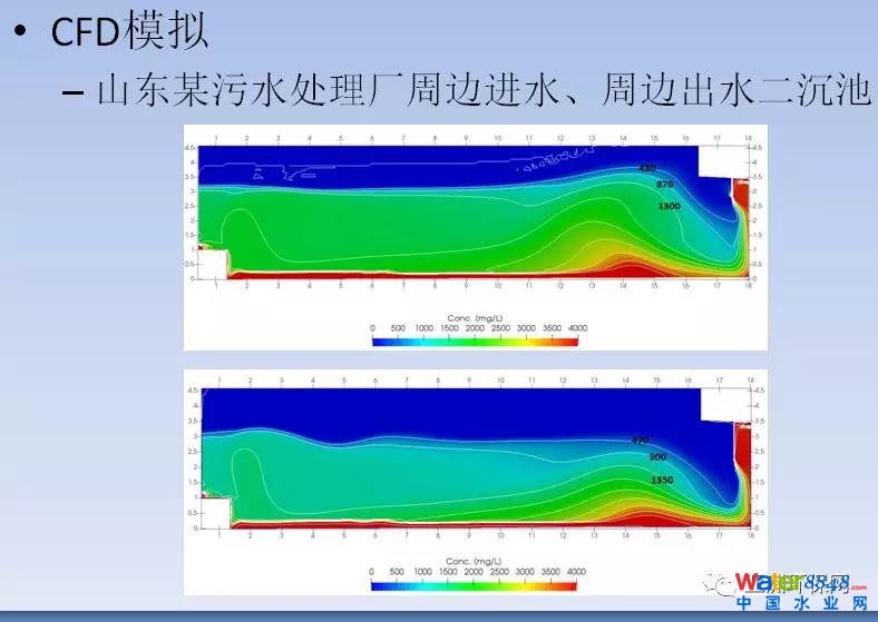 這是山東某污水處理廠的周邊進(jìn)水、周邊出水的二沉池的CFD模擬,通過(guò)模擬發(fā)現(xiàn),進(jìn)水裙板的高度對(duì)二沉池的流態(tài)有重要的影響,加長(zhǎng)了裙板以后,出水SS就會(huì)降低很多,把污泥層的界面也降低很多。