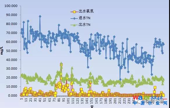A2O是最常用的工藝,受制于實(shí)際內(nèi)回流比的影響,即使在碳源充足的情況下,A2O工藝的脫氮率最高一般就在70%左右。所以如果進(jìn)水TN小于50mg/L,出水TN達(dá)到15mg/L是可以的,但要求達(dá)到10mg/L以下是非常困難的。這是一個(gè)大型A2O工藝的污水處理廠進(jìn)出水TN曲線圖,這個(gè)廠的進(jìn)水碳源很充足,脫氮率一般就在70%左右。