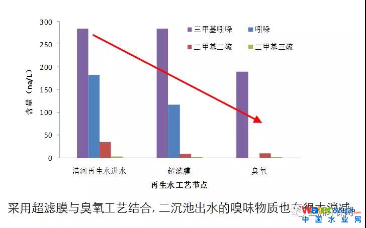 研究團隊在清河污水處理廠做的試驗,二級出水里,對不同嗅味物質(zhì),經(jīng)過不同的處理工藝,有不同的處理效果。尤其是臭氧,對吲哚結(jié)構(gòu)完全去除掉了,但是對二甲基、三甲基沒有去除,總體來說去除效果還是非常好的。最終北京近四百萬噸的大型污水處理廠全部采用二級出水后續(xù)反硝化濾池、硝化濾池,而且硝化濾池是可選的,有些廠沒有硝化濾池,后面就是普通的濾池加上臭氧,及消毒。