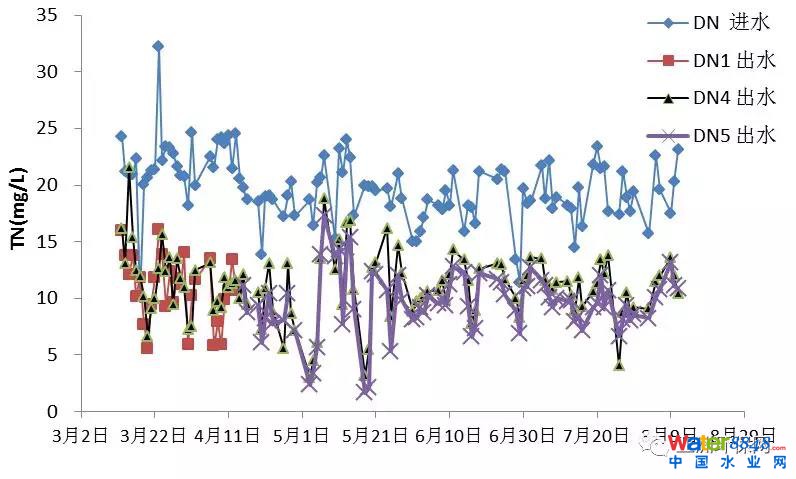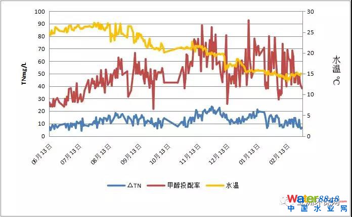 甲醇投配率/△TN受水溫影響變化較大,水溫較低時,反硝化速率下降。6-10月甲醇投配率/△TN為2.72,11-2月甲醇投配率/△TN為3.37.