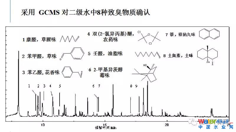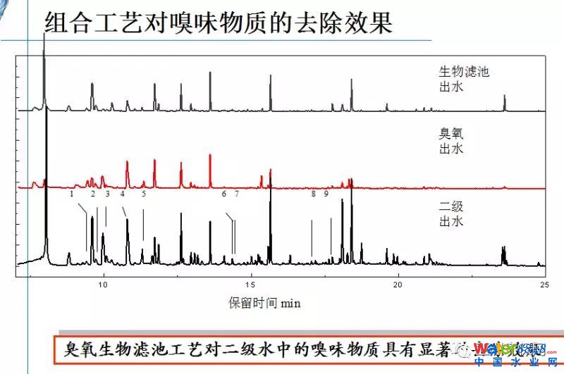 在臭氧脫色研究中,研究人員做了三個樣本,二級水明顯可以看出有色度,經(jīng)過臭氧和活性炭基本上沒色,特別是二級水有深度的茶葉顏色,但是臭氧濃縮一百倍還是無色。通過分析致色物質(zhì)的主要來源,明確主要的致色物質(zhì),二級出水中就是腐植酸和富里酸。對二級出水的嗅味物質(zhì)進行辨識,主要是8種致味物質(zhì),其中腥臭味(土腥味)的物質(zhì),主要是糞臭素的這一類物質(zhì)。通過生物濾池、臭氧,對二級出水中的臭味物質(zhì)的去除效果進行了試驗,基本上是臭氧和生物濾池的結(jié)合,都能夠?qū)Τ粑段镔|(zhì)有50%的去除效果。