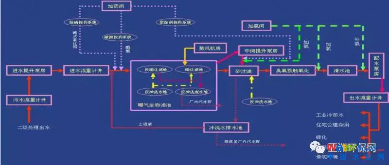 下圖是清河污水處理廠試驗深度處理的工藝方案。