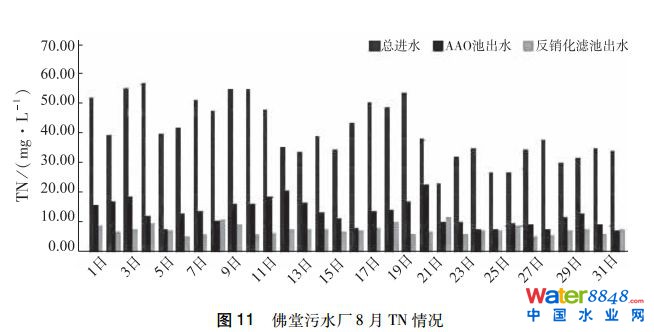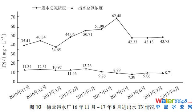 (4)根據(jù)佛堂污水廠現(xiàn)有的工藝調(diào)控手段,出水總氮尚無(wú)法達(dá)到地表Ⅲ類水標(biāo)準(zhǔn),但根據(jù)不同的進(jìn)水條件、水溫、碳源投加量和工藝參數(shù)調(diào)整等,出水總氮可控制在10mg/L以下。