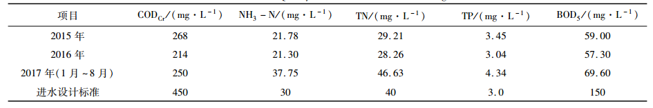 表2 佛堂污水廠近三年進(jìn)水濃度統(tǒng)計(jì)表