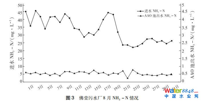 AAO工藝的運(yùn)行,對(duì)溶解氧有較高的要求,缺氧和厭氧區(qū)需保持低溶解氧狀態(tài),缺氧區(qū)溶解氧一般在0.5 mg/L以下,厭氧區(qū)一般在0.2 mg/L以下,好氧區(qū)溶解氧一般控制在2~3 mg/L。缺氧、厭氧池溶解氧過(guò)高,將抑制聚磷菌的釋磷和反硝化過(guò)程,影響生物脫氮除磷效果,而好氧段溶解氧過(guò)低,則會(huì)抑制聚磷菌吸磷和硝化過(guò)程,同時(shí)易引起二沉池厭氧釋磷,影響脫氮除磷效果。佛堂污水廠通過(guò)調(diào)整曝氣量,調(diào)控好氧區(qū)4組廊道的溶解氧,將好氧區(qū)溶解氧控制在2~4 mg/L,通過(guò)降低好氧區(qū)末端廊道曝氣量,將好氧區(qū)末端溶解氧控制在2 mg/L左右。通過(guò)合理的好氧區(qū)溶解氧濃度控制,可保障硝化反應(yīng)的充分進(jìn)行,確保出水氨氮在1 mg/L以下。