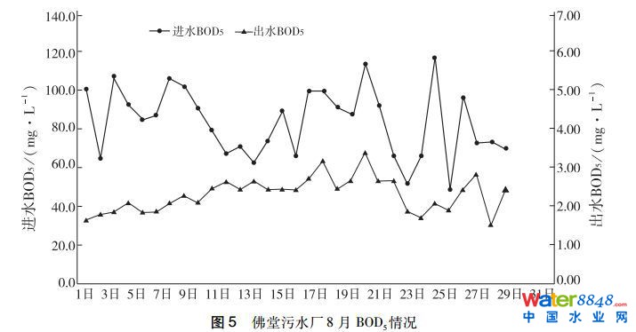 表4佛堂污水廠8月份進(jìn)、出水水質(zhì)情況