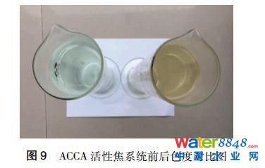 (3)通過(guò)ACCA活性焦多級(jí)吸附系統(tǒng),可明顯降低出水色度,出水基本呈無(wú)色透明狀。