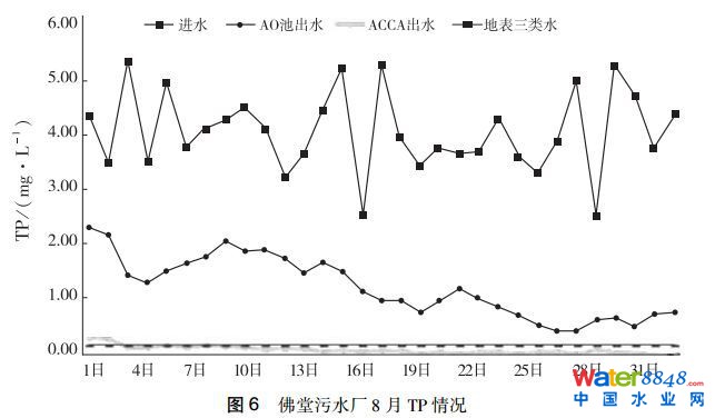 佛堂污水廠總磷經(jīng)過(guò)AAO池生化除磷+高效沉淀池+ACCA活性焦多級(jí)吸附系統(tǒng)處理后,出水總磷在0.2mg/L以下,符合《地表水質(zhì)量標(biāo)準(zhǔn)》(GB3838—2002)中Ⅲ類水標(biāo)準(zhǔn)。