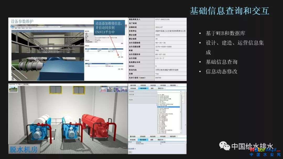 既然BIM模型包含了完整的設(shè)計(jì)、建造和運(yùn)營(yíng)信息,那么我們就可以按需對(duì)設(shè)備、管道等的基礎(chǔ)資料進(jìn)行查詢,比如選中三維視圖中的某個(gè)閥門(mén),平臺(tái)自動(dòng)檢索出該閥門(mén)的生產(chǎn)廠家、安裝時(shí)間、備品備件等信息;同時(shí)我們可以對(duì)設(shè)備的信息進(jìn)行更改和更新,比如增加一條檢修記錄,數(shù)據(jù)庫(kù)會(huì)自動(dòng)同步,保證平臺(tái)信息的即時(shí)性和有效性。