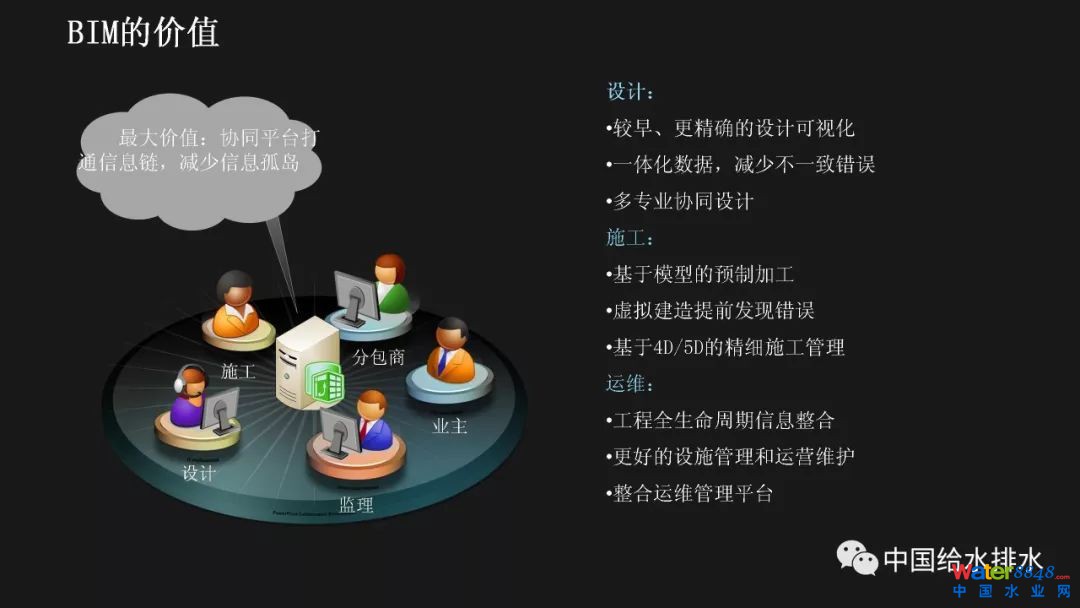 前面提到,對(duì)于智慧水務(wù)來(lái)說(shuō),是要消除“孤島應(yīng)用”。BIM的最大價(jià)值也在于通過(guò)信息技術(shù),把業(yè)主、設(shè)計(jì)、施工、監(jiān)理、分包商等整合到一個(gè)協(xié)同平臺(tái)上來(lái),降低信息不暢帶來(lái)的額外支出和成本,減少信息孤島。