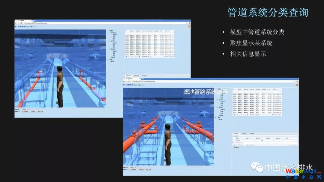 在BIM模型中我們可以采用與實(shí)際工程實(shí)體相似的處理方式,對(duì)不同的管道系統(tǒng)進(jìn)行著色區(qū)分。更優(yōu)越的是,我們可以單獨(dú)的亮顯某一管道系統(tǒng),更清楚地瀏覽管道走向和功能,甚至可以采集監(jiān)測(cè)信息,將管內(nèi)的介質(zhì)信息反映到BIM模型中來(lái)。如此我們的BIM模型不僅可以顯示工程建設(shè)的靜態(tài)信息,也能顯示運(yùn)行階段的動(dòng)態(tài)信息。