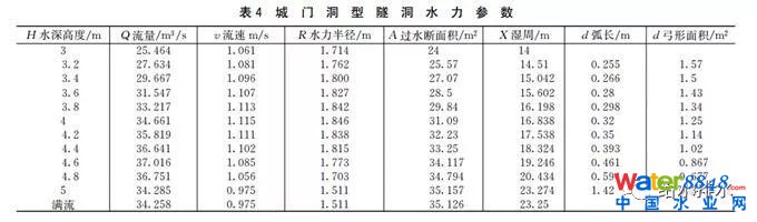 計算過程中對于斷面不規(guī)則的隧洞部分,首先進行了不同流量下的標準水深計算,設計采用粗糙度n=0.013 5,i=0.1‰進行計算,對于頂部不規(guī)則部分進行水力半徑計算,計算表如表4,分別得出對應的流量和流速,用于疊加工況水力計算。