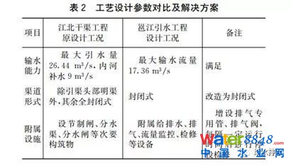 輸水能力和輸水安全上,干渠除頭部220 m采用明渠外,其余斷面采用全封閉式,可滿足供水工程對水質安全的要求。干渠供水重力流下最大流量為26.44 m3/s,可滿足近期受水水廠17.36 m3/s的需水量,并有一定余量仍可供河道補水用。設計參數對比詳見表2。