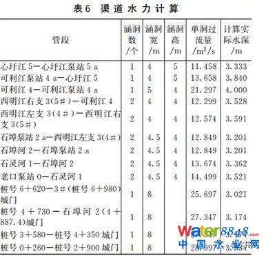 計算時由干渠末端水量和斷面尺寸倒推上游水位,對于矩形與城門洞型隧洞漸變段考慮水頭損失和因流態(tài)變化產生的水躍或雍水造成水位變化。推算到渠道首部城門洞型時采用插值法確定水深,經校核水深誤差在1%以內。計算表結果如表6所示。