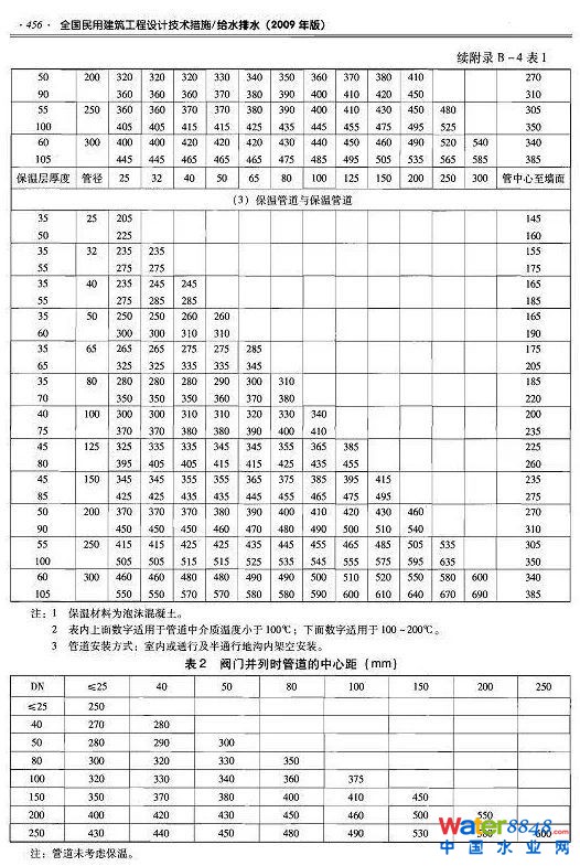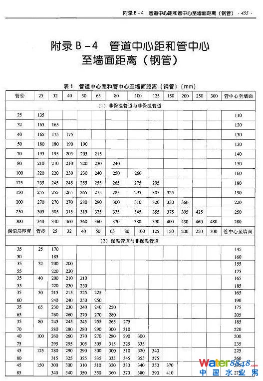 注:(1)鋼立管凈距指給水、采暖立管外壁與墻、柱的距離。(2)表中管中心與墻、柱的安裝距離使用于水平干管的安裝