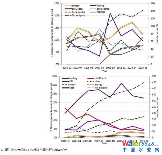 ▲ 膜法海水滲透和MBR污水處理的研究趨勢統(tǒng)計