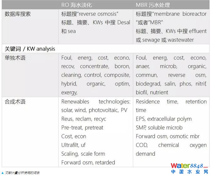 在分析膜技術(shù)的研究趨勢方面,西蒙·賈德教授使用下表的文獻(xiàn)計量分析方法對RO海水淡化和MBR污水處理的關(guān)鍵詞進(jìn)行了搜索統(tǒng)計。