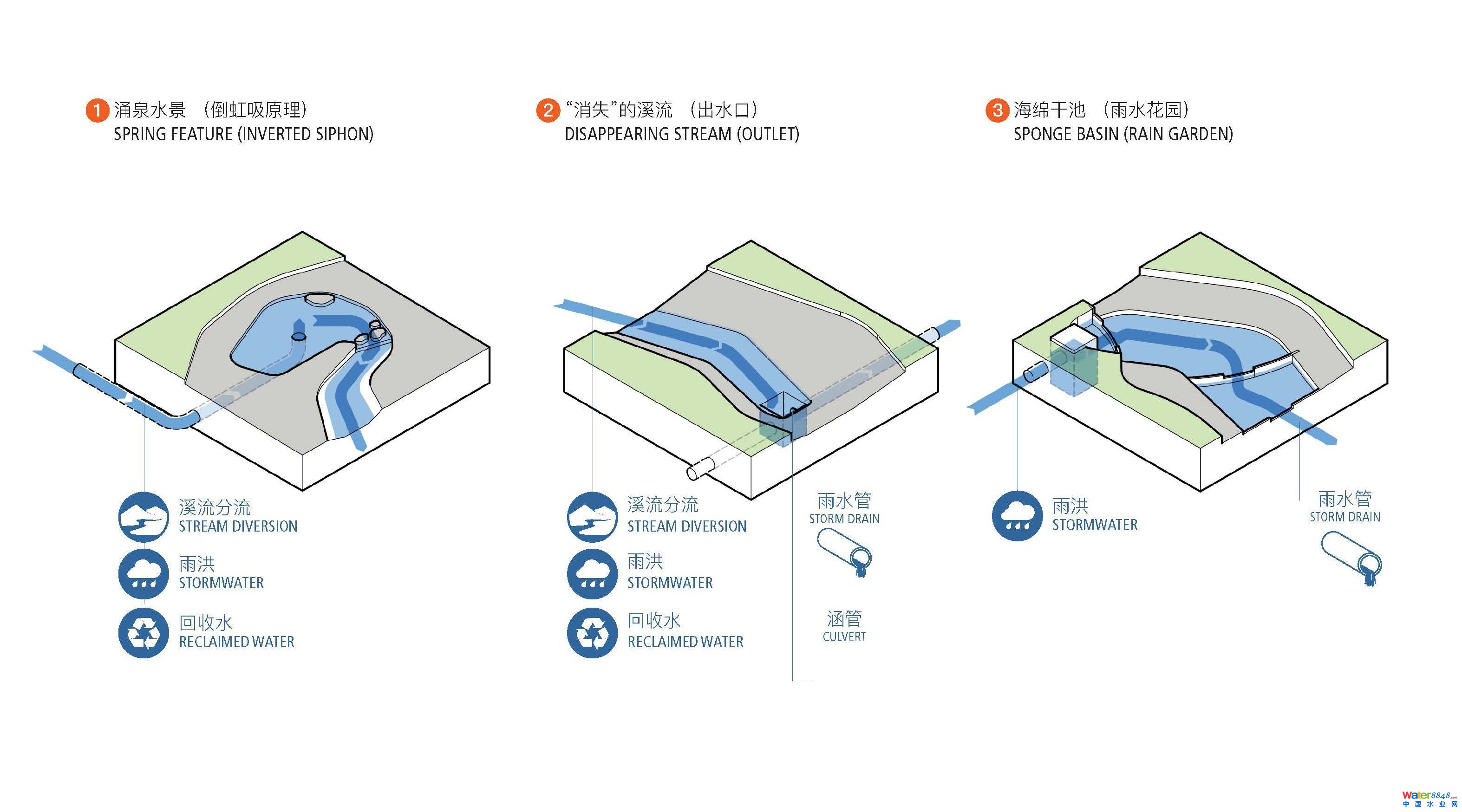 經(jīng)過多番努力,團(tuán)隊(duì)最終得出的景觀方案融合兩者精髓,呈現(xiàn)靈活彈性,體現(xiàn)區(qū)域特質(zhì)。濟(jì)南南部的泰山地區(qū)擁有喀斯特地形,那里也是城內(nèi)眾多名泉的源頭。方案以此為靈感泉源,仿效涌泉、忽然轉(zhuǎn)往地下的河流和季節(jié)性河流(雨水花園)創(chuàng)造多樣化的景觀元素,呼應(yīng)“海綿城市”這一主導(dǎo)概念。
