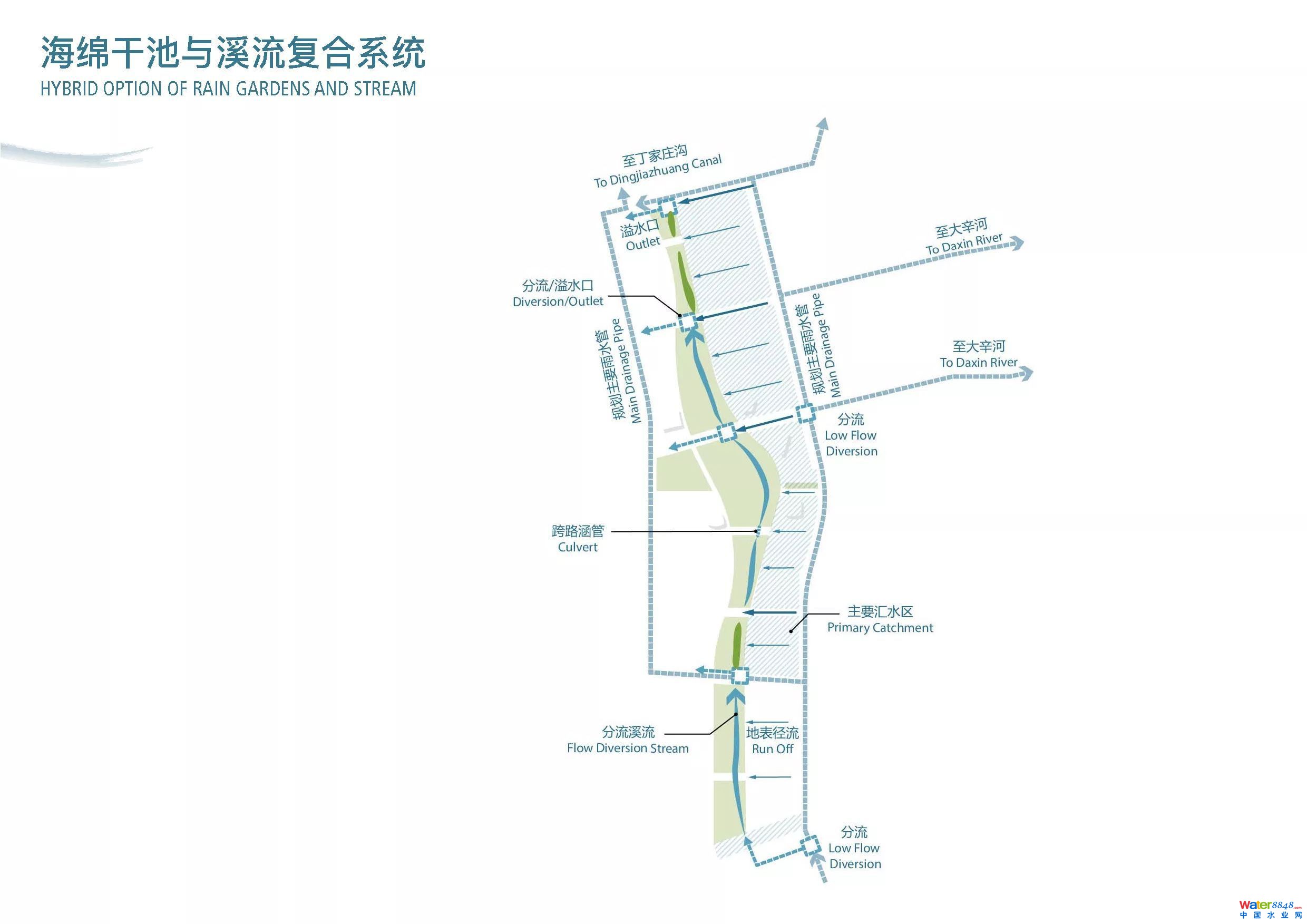 其中,一條按計(jì)劃被改成暗溝的水道是丁家莊溝。在設(shè)計(jì)初期,項(xiàng)目團(tuán)隊(duì)參考了世界各地成功的河川重現(xiàn)和復(fù)育案例,力圖將這條2公里長的排水廊道保留下來。然而即將興建的地下基礎(chǔ)設(shè)施(包括公用管線、地下街道、地下停車場、地下商店和地鐵隧道)布局復(fù)雜,層層疊疊,面對如此密集的地下開發(fā)內(nèi)容,要全面恢復(fù)丁家莊溝實(shí)屬不易?紤]到中央商務(wù)區(qū)的總體規(guī)劃工作已進(jìn)入尾聲,雖然團(tuán)隊(duì)深知這對場地營造極其有利,也對改善生態(tài)和水質(zhì)帶來很多好處,這項(xiàng)恢復(fù)工程最終不得不被迫放棄。
