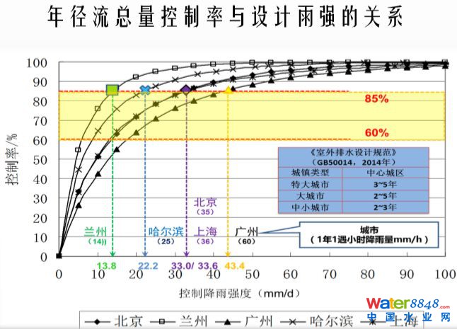 根據(jù)以上數(shù)據(jù),并結(jié)合我國(guó)的氣候能耗特點(diǎn),我們又做了全國(guó)范圍內(nèi)包含200多個(gè)城市的降雨徑流控制率分布圖(如下圖所示)。但是,作為一個(gè)基本的設(shè)計(jì)參數(shù)。建設(shè)海綿城市不僅要解決量的問(wèn)題,還要解決質(zhì)的問(wèn)題。