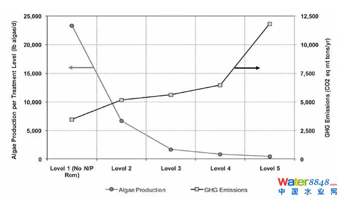 由于污水營(yíng)養(yǎng)物去除旨在改善水體,減少受納水體藻類(lèi)生產(chǎn)過(guò)程中的富營(yíng)養(yǎng)化,因此我們使用一個(gè)替代參數(shù)——“潛在藻類(lèi)產(chǎn)量”來(lái)評(píng)估水質(zhì)改善狀況。每生成100磅藻類(lèi)需要7.2磅的N和1.0磅的P。依據(jù)此關(guān)系,將藻類(lèi)產(chǎn)量的減少表示為N或P減少的函數(shù)。結(jié)果表明,處理等級(jí)從1級(jí)變化到3級(jí),潛在藻類(lèi)產(chǎn)量減少了將近95%;從3級(jí)變化到5級(jí)時(shí),又減少了4%,而這部分增量的改進(jìn)卻幾乎使溫室氣體排放量翻了一番。
