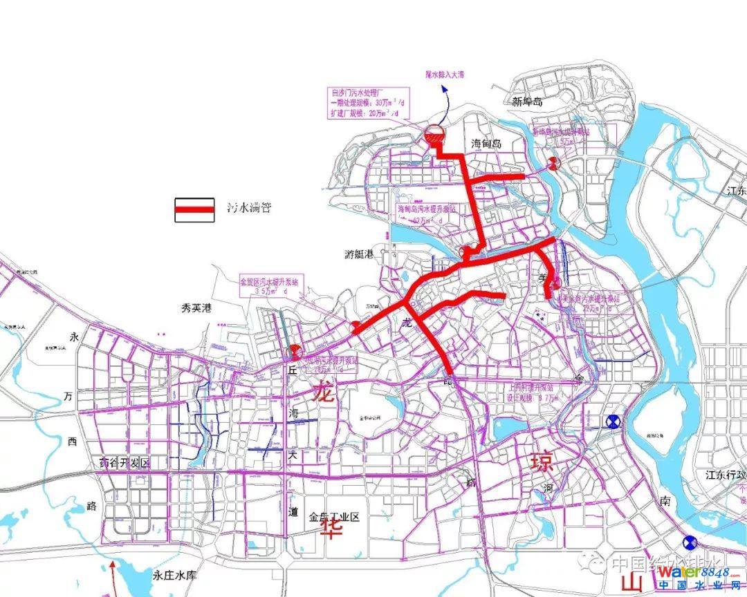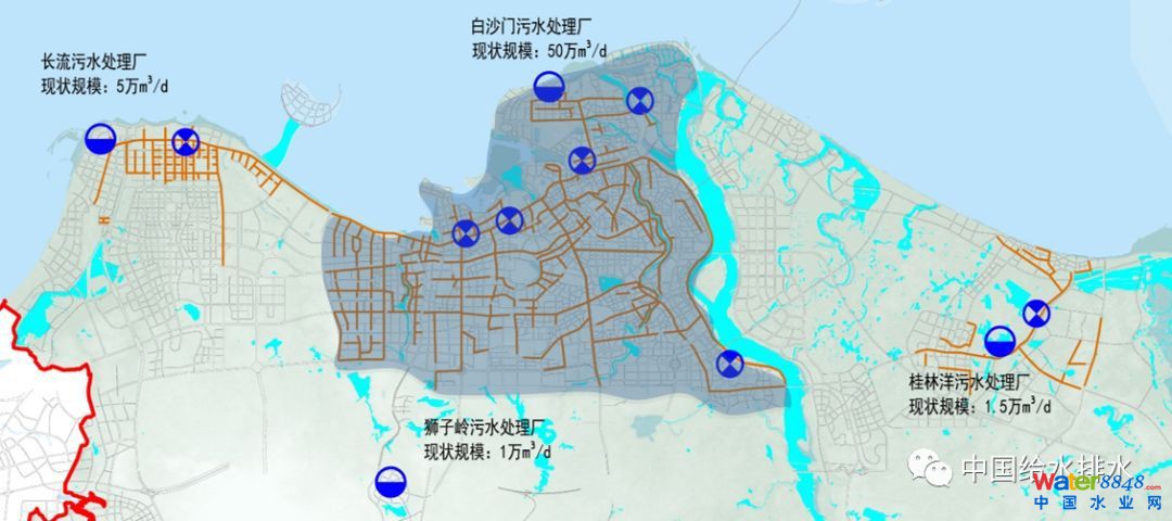 傳統(tǒng)的污水處理廠布局,受處理工藝、設(shè)施環(huán)境影響、受納水體環(huán)境容量等因素影響,一般選擇在城市主要河道的下游,距離主城區(qū)較遠,需要長距離管道輸送。?谥行某菂^(qū)白沙門污水處理廠位于城市最北邊,管道從城市最南邊輸送25公里以上,經(jīng)多級提升,接入最北邊的污水處理廠。由于管道建設(shè)年代較久,滲漏破損等問題嚴重,造成大量地下水,海水,河水倒灌入污水管道,嚴重影響了現(xiàn)狀污水系統(tǒng)的正常運行。