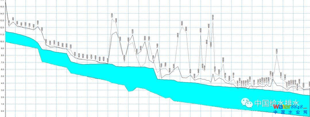 圖15 美舍河20年一遇洪水水面線縱斷面圖