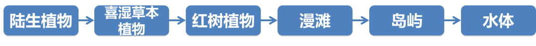 美舍河下游受海潮影響,水體鹽度較高。在濱河淺灘濕地植物中,選擇以紅樹植物為主體的常綠灌木或喬木組成的潮灘濕地生物群落,構(gòu)建水體、島嶼、漫灘、真紅樹植物、半紅樹植物、喜濕草本植物、陸生園林植物等從水到陸演替的7個生境序列(見圖13),營造獨特的紅樹林濕地生態(tài)系統(tǒng),形成藻類、魚類、兩棲類、鳥類等生物的生境空間。