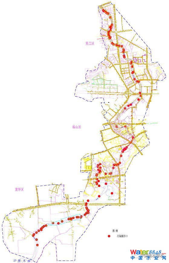 ?谑信潘到y(tǒng)欠賬問題嚴重,目前美舍河所在的主城區(qū)近90平方公里范圍內(nèi)的生活污水全部排入城區(qū)最北側(cè)的白沙門污水處理廠,F(xiàn)狀該污水處理廠處于滿負荷狀態(tài)運行,主干管網(wǎng)近16.6公里處于滿管狀態(tài),F(xiàn)狀污水管道及污水廠進水濃度較低,近1/3的地下水、河水、海水等外來水倒灌入污水系統(tǒng),清潔的水資源占用了污水管道和處理設(shè)施的空間,造成大量生活污水直排入河。?谑兄鞒菂^(qū)現(xiàn)狀污水系統(tǒng)及管網(wǎng)滿管分布見圖2。