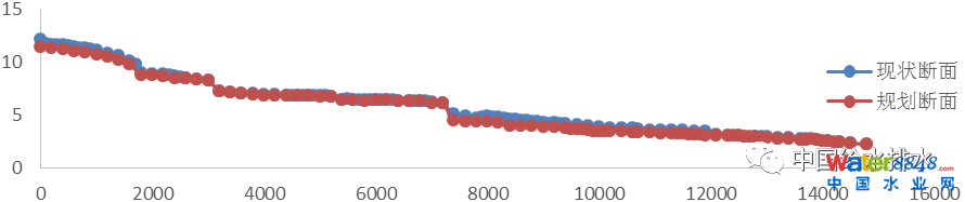 圖16 美舍河現(xiàn)狀斷面和改造后斷面20年一遇洪水水面線對比圖