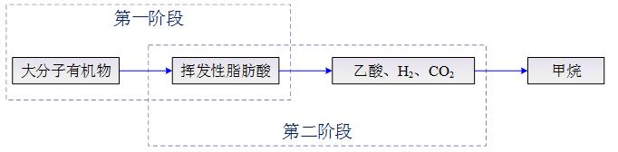 厭氧過程一般分為三個(gè)階段[2]:水解發(fā)酵階段、產(chǎn)氫產(chǎn)乙酸階段、產(chǎn)甲烷階段。水解酸化就是將厭氧過程控制在反應(yīng)速率較快的第一階段和第二階段,即將大分子雜環(huán)的不溶性有機(jī)物水解為小分子的可溶性有機(jī)物,將難以生物降解的大分子物質(zhì)轉(zhuǎn)化為易生物降解的小分子有機(jī)物質(zhì)的過程,如圖1的第一階段和第二階段: