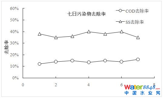 在UC水解穩(wěn)定運(yùn)行一年后,連續(xù)七天監(jiān)測進(jìn)入U(xiǎn)C水解前和經(jīng)過UC水解處理后的水質(zhì),對(duì)COD值和SS值進(jìn)行檢測,得出以下結(jié)果: