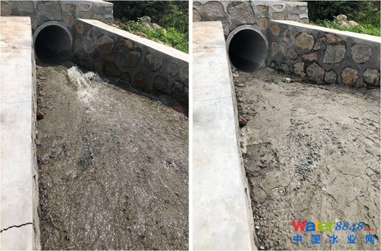 天鵝灣社區(qū)附近何家溝沿岸排污口突然斷流,20分鐘內(nèi)排污口對(duì)比圖。 (余璐 攝)