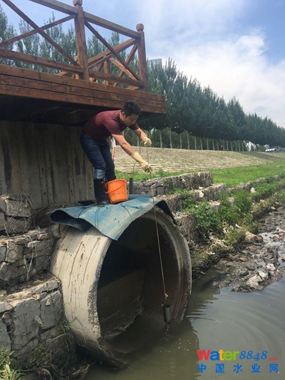 督查組人員在何家溝入松花江口進(jìn)行黑臭水監(jiān)測取樣。(余璐 攝)