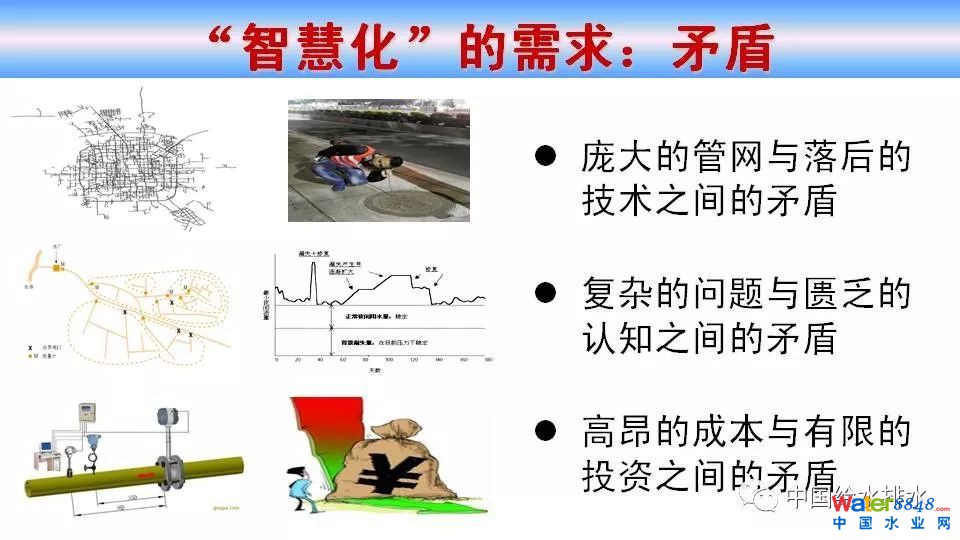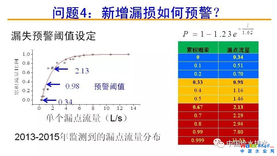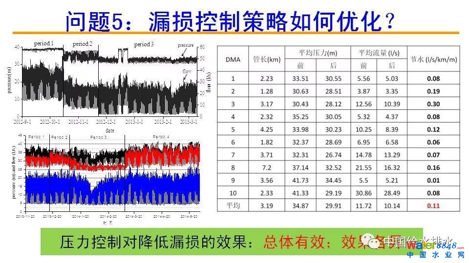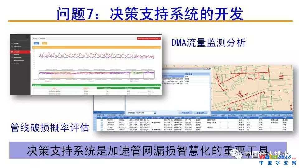 新版《城市供水管網(wǎng)漏損控制及評定標準》規(guī)定:城鎮(zhèn)供水管網(wǎng)基本漏損率分為兩級,一級為10%,二級為12%。“水十條”要求到2017年,全國公共供水管網(wǎng)基本漏損率達到二級標準,到2020年達到一級標準。而多數(shù)城市供水均未達到這一標準。報告首先給出了“智慧化”需求、發(fā)展及特點,然后介紹了漏損控制的基本流程,即評價→檢測→控制,并對漏損用什么指標評價(漏損率、單位管長漏損、管網(wǎng)漏失指數(shù)),如何用好最小夜間流量,DMA規(guī)模的確定,新增漏損如何預警,漏損控制策略如何優(yōu)化,非DMA管線的漏損控制,決策支持系統(tǒng)的開發(fā)(決策支持系統(tǒng)是加速管網(wǎng)漏損智慧化的重要工具)等7個問題進行了論述。報告還指出,對于供水管網(wǎng)漏損控制,一定要重視基礎(chǔ)資料和監(jiān)測數(shù)據(jù)的收集,切忌生搬硬套現(xiàn)有的理論和方法。